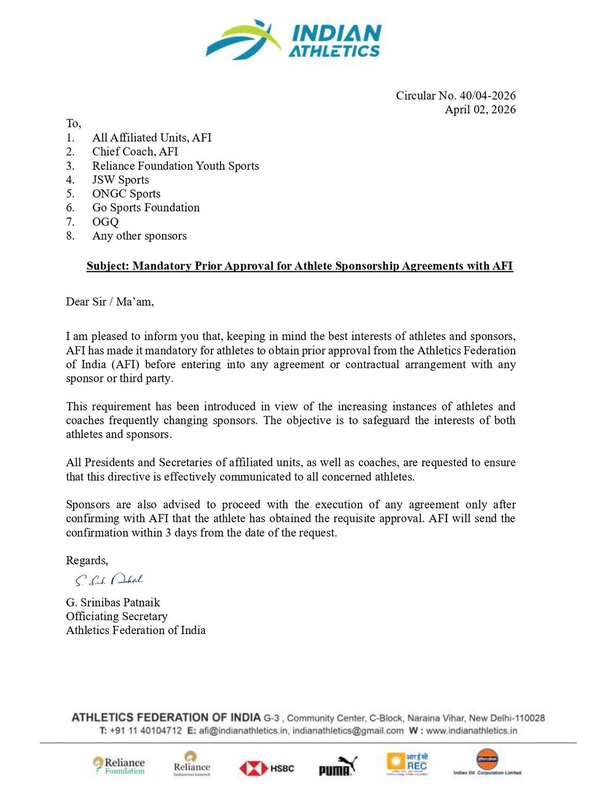 “Sponsors are also advised to proceed with the execution of any agreement only after confirming with AFI that the athlete has obtained the requisite approval. AFI will send the confirmation within 3 days from the date of the request.”